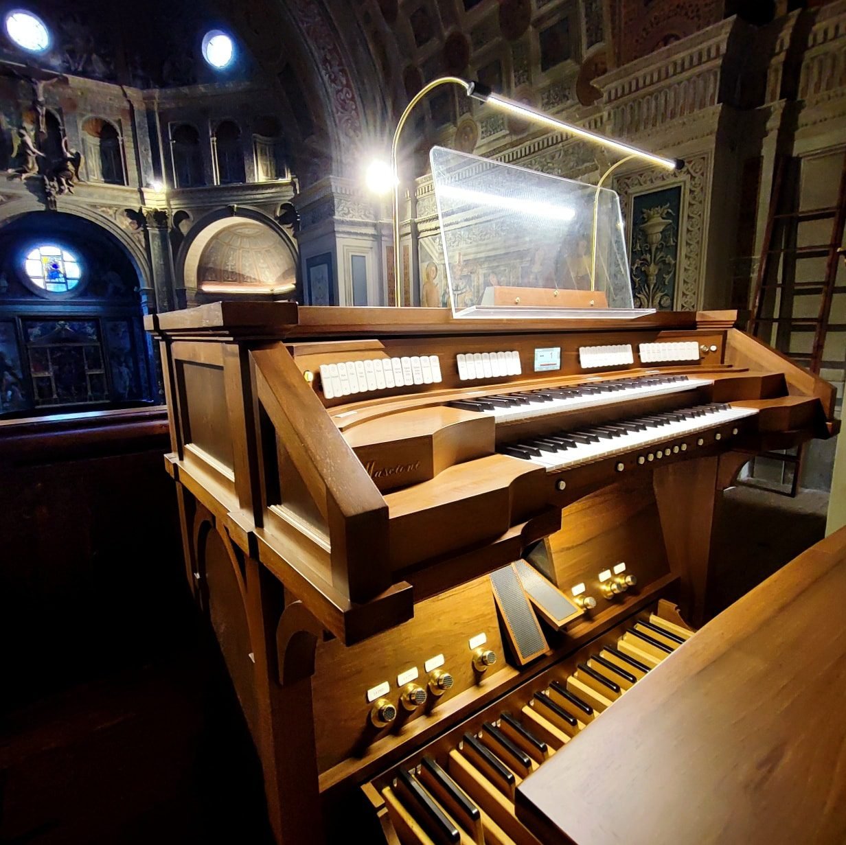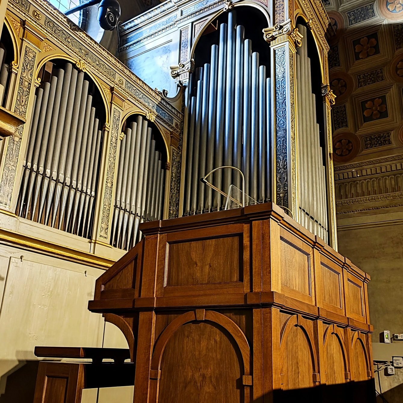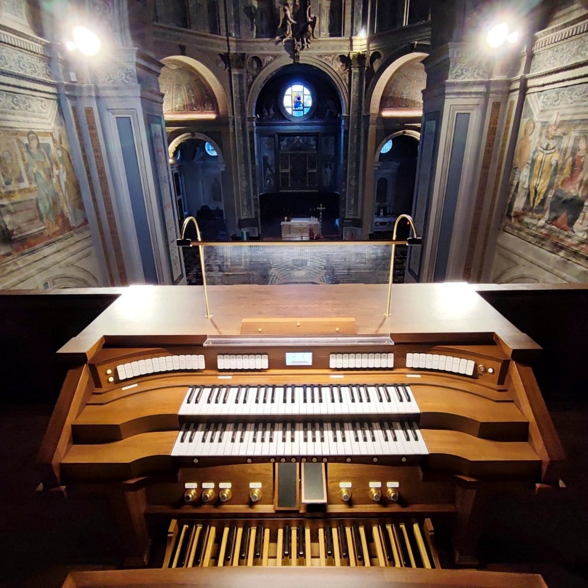 L’organo attualmente possiede due consolle “gemelle”, una in cantoria e una mobile in navata. Sono state appositamente progettate per integrarsi esteticamente con la cassa storica e per dialogare con la splendida architettura bramantesca della Basilica.