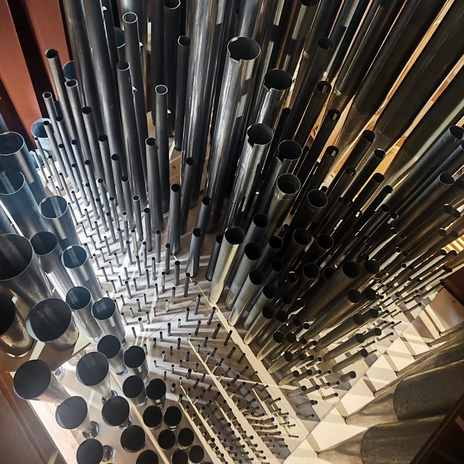 Il nucleo fonico dello strumento, restaurato e integrato presso il nostro laboratorio, ingloba al suo interno tre stratificazioni storiche: Gian Giacomo Antegnati 1542, Giovanni e Girolamo Carrera 1814, Giorgio Maroni 1920.